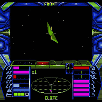 I know this game from C64, I played it this time on Amiga. This game makes much fun. But I played it only when outside is dark, I dont like it to play at day, when sun is shining. There are some enemies which are easy and some which are stronger and hard to defeat. But the docking on the station is too hard, later you can buy a docking computer. When I fly in Elite through the space I must think on the serie 'Ion Tichy'. I find it good, that the shield of your ship is regaining. There are many planets to explore.
