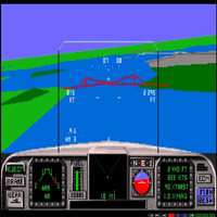Flying in this game makes much fun. I dont choose the missions, I take the Freeflight to enjoy the fast gfx on Amiga. It is funny to fly on a building and steer up in the last moment (what would the inhabitants of this house thinking?). But the best is to fly under the red bridge, which reminds on the Golden Gate in San Francisco. You have enough sprit to fly a long while. When you fly a while to high you come in the stall and then be cautious! The aircraft you fly is the F18.