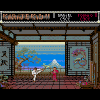 This game is made by Microdeal in the year 1987. This is a fighting-game. With the stick you move, with fire you hit or kick. It is the game after the movie. There are several kicks or hits you can make. The first enemy is in a training hall. The second enemy is in the ghetto, the third in a garden. After two battles there comes a bonus-round. In the bonus-round you must hit many plates.