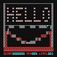This game is made by Broderbund in the year 1984. This is a classic game. With the stick you move and with fire you make a hole in the platform. You must collect boxes and avoid the other men. In each level you must collect a given number of boxes. Sometimes there are ropes in the air which you can use to get to the other side. This game has 50 level. This is the follower of "Loderunner".