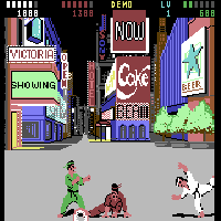 This game is by Beam in the year 1988. This is a fighting-game. With the stick you move, with fire-button you can make different kicks or hits. When you play alone you must fight against two other fighters. There is a 2-Player-Mode. In the game are voice-samples. The background is a big city. There you can see adverts like from Coca Cola.