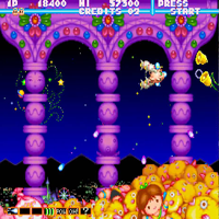 This is a good game. The sprites of the enemies are very funny. In the begin you can select a spaceship like an octopus or a penguin or the twin bee. It is not so hard to play like "Gradius", to the third level it is no problem. The music is very comedy. Funny enemies are teeth with a tongue or a belly dancer. The first boss is a big pirate cat. When you shoot the bells you get smartbombs.