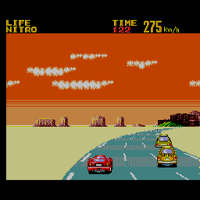 This game is made by Sega in the year 1989. This is a racing-game. With the stick you move, with B you give speed. In the begin of each level is shown the target car you must get. At the start you can select a song for the game. In the first level you see in the background the Golden Gate Bridge. You must ram the target car so often until it is destroyed. Each level has a time-limit.