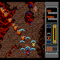 This game is made by Tecno Soft in the year 1990. This is a vertical shooting-game. With the stick you move, with A is shoot forward, with B is shoot backward. You move automatically forward. It is in a fantasy-scenario. There is a little intro but in japanese text. First you must solve three level, then you can play three other. When you solve a level you get a new spell. You can get extras like shield or more energy.