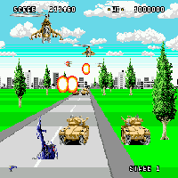 This game is made by Sega in the year 1988. It is a shooter with a helicopter. This is an upgrade of the coin-op-version. With the stick you move (when you press ahead you move down, to the rear you move up), with the A-button you shoot normal, with the B-button you shoot missiles. In this version the first level is shown from 3D. Avoid the houses, if you touch them you explode. The first level is in a town, then come mountains and a sea. In the game you must fight against rebels.