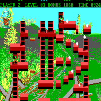 This is a nice game. I can play it and have fun. The joystick-control don't work right. The controls of keyboard are: 'o' for left, 'p' for right. And climb up is "q" and go down is "a". When you climb up or down there are some problems to get on the platform again. But then hit space-bar, then you jump on the platform. In the begin you can choose between CGA, EGA and Tandy.