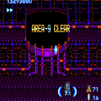 This game is made by Hudson in the year 1989. This is a sci-fi-shooter. You fly from down to up, the screen is vertical scrolling. With the stick you move, with the A-Button you throw bombs, with the B-Button you shoot. There are many sprites on the screen. This game has 12 levels. Here are high-tech-levels, deserts and bloodstreams. There are many extras like satellites, shields and rockets.