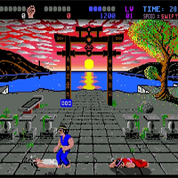 This game is made by System 3 in the year 1988. Here you control alone or with a friend a fighter. On the stage are three karatekas which fight for the first prize. If you hit one to the ground you get a point. That man, who has 6 points in a round is the winner. If you are third you are game over. Between some levels are bonus stages, where you must defend with a shield rolling balls. There are ten possible various hit-techniques and one defend-option, to cross over. Which belt you get depends on the points you are making in the game.