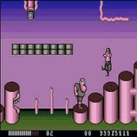 This game is made by Virgin in the year 1990. This is an action-game. With the stick you move, with fire you shoot a fish. First you are a man, then you transform to a fish. You play Gumby which lost his mind. The enemies are bizarre like vikings in wheelchairs or pigs with screws. The player with less points is on the top of the highscore. There are four levels. In the begin is digitalized speech, sometimes come a funny seqeunce.