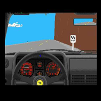 This game is by Accolade, a good game. In this game you sit in a car and see the road from the front. The road is on a mountain, on the other side is the abyss. When you drive too fast the policecar is hunting you. You can choose between some cars, a Porsche, a Ferrari or a Lamborghini. Right on the top you see a rear-mirror. Sometimes doves poop on your windshield. The game is from 1987.