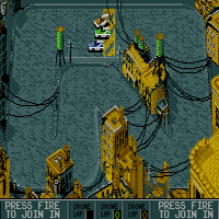 This game is made by Domark in the year 1990. This is a racer-game. You control your car with the stick, with fire you give speed. The view is from top-down. You can collect repair-extras. The first course is the city. The maker of this game made "Super Sprint", too. It was first a coin-op.