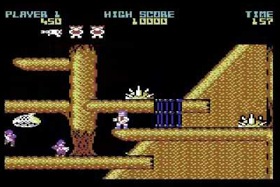 This game is by Capcom in the year 1987. Here you are in a landscape with trees. With a diagonal move of your stick you throw your teleskop-arm on a tree, then you shimmy to the other side. There are enemies you must shoot with your button. First this game was a coin-op. There are five big levels. In this game are extra-weapons, which are flying and you must collect. There are sometimes big grates in your way which you must shoot down.