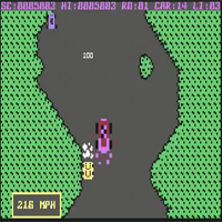 This game is made by Colosoftware in the year 1983. This is a classic racer-game. With the stick you move and with fire you jump with your car. The view is from above. When you land after a jump on another car it disappears and you get points. Each level has different colors. Sometimes a water-obstacle comes and you must jump over it. There is an amiga-game with the same name, but it has nothing to do with this game.