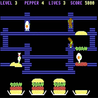 This game is made by Interceptor in the year 1984. This is a classic game. With the stick you move and with fire you leave some pepper. The pepper blocks your enemies. In each level you must make some big burger. The ingredients of the burger lies in the level, you must walk over it that it falls one floor deeper. You can collect sometimes some pepper. This game was first a coin-op.