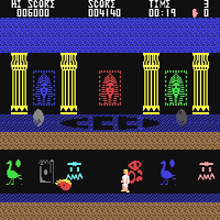 This game is by Alpha-Omega Software in the year 1986. This is a jump'n'run-game, the screen scrolls horizontal. With the stick you move, with fire you jump. There are holes which you must jump over. When you jump in a hole you lose a life. Sometimes you can grab a chest, which gives you many points. The highscore will be saved. Sometimes there is a liana which you can take to get over the holes.