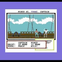 This game is by Microprose in the year 1987. This is a strategy-action-game. With the stick you move, with fire you make your decisions. In the begin you select your area, difficulty and nationality. On a card of the carribean sea you navigate your ship. When you attack a ship you must navigate on the enemy-ship,you can shoot with your cannons. On the board you must fence with the other captain. When you hit him he loses crew-member.