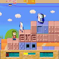 This game is made by Sega in the year 1986. This is a jump'n'run-game. You move with the stick, with the one button you shoot, with the other you jump. But you can only shoot when you collect the extra. There is another extra with which you can jump very high. You can't kill the enemies when you jump on their head, you must jump over them or shoot them. There is a 2-Player-Mode. This game is ported on Sega-Master-System.