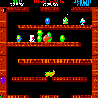 This is a good game. The sprites look very cute! And it has fabulous music with a great melody. When you can play it with a friend, it makes very much fun. Get the snakes, with them you rip down the level and catch all monsters in your way. You can collect letters of the word "EXTEND", when you get all you get a bonuslevel and a extralife. On coin-op the ssecond player can everytime get in the game. When you fall down (and the monsters) you are at the top of the level.