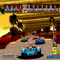 What for a great game! The graphics are very fast, it makes much fun. The coin-op has a wheel which rumbles at a crash. When you drive in a curve the screen goes diagonally. There is also a course at night in New York. It goes not only left or right, you drive also rapid up and down. At some courses you get dizzy. When you press during the drive the start-button you see your driver from ahead how he makes wild grimace.