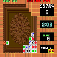 This game is made by Taito in the year 1989. It is a puzzle-game. Here you must combine a set of blocks with symbols. With the stick you move, with the button you throw a block. From the left you throw a block, if the block on the right has the same symbol both vanish. Another block from the heap gets in your hand. If you dont throw the fitting block it comes back to you. There are also blocks with a thunder-symbol, they fit with every block.