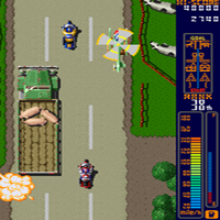 This game is made by Taito in the year 1988. This is a racing-game. You move with the stick, with the one button you give speed, with the other you brake. You must get under the 30.place to get into the next level. This game is similar to "Spy Hunter". You must get petrol-symbols to drive on. Sometimes there comes a helicopter which leaves an extra. When you refuel, it is important, but you lose time.