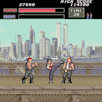 This game is made by Irem in the year 1988. Here you must rescue Madonna and fight against thugs. The screen scrolls horizontal from left to right. With the stick you move, with the one button you hit, with the other button you kick. In the levels you find a nunchaku. The first level is in a town, then come a junkyard and a long bridge. At the end of each level is an endboss, in the second are two. You have an energy-bar shown at the top of the screen.