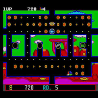This game is made by Sega in the year 1987. Here you are in a maze like in pac-man. You control with the stick your ship. In the maze are extras which you can collect. It is the thrid part of the fantasy-zone-saga. You must collect coins, then you can buy extras. More speed, laser or fireballs are some extras. There are 28 levels.