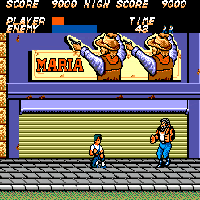 This game is made by Sega in the year 1988. Here you must rescue Madonna and fight against thugs. The screen scrolls horizontal from left to right. With the stick you move, with the A-button you hit, with the B-button you kick. In the levels you find a nunchaku. The first level is in a town, then come a junkyard and a long bridge. At the end of each level is an endboss, in the second are two. You have an energy-bar shown at the top of the screen.