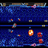 This game is made by Sega in the year 1990. This is a shootem-up-game. With the stick you move, with A you change between robot and spaceship, with B you shoot. In the begin is an intro. It's a classic shootem-up with many extras. You can get a satellite which shoots with you. Some enemies are coming from behind. Each stage has an endboss. The second level is faster, the music is there faster, too.