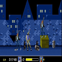This game is made by Sega in the year 1990. This is a horizontal fighting-game. With the stick you move, with A you turn, with B is kick, with C is jump. You have magical power with your kick. The game starts like the movie, Micheal is throwing a coin in a jukebox. In the game are musictunes of Micheal Jackson. You must in each level rescue a special amount of blonde girls. After you have rescued all amonkey sits on your shoulder and show you the way to the endfight. It starts in a bar, then it goes to the city and then comes a cemetery.