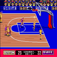 This game is made by Sega in the year 1990. This is a basketball-game. With the stick you move, with C is passing, with B is throwing on basket. The screen scrolls horizontal. There is a 2-Player-Mode. You can select between eight teams of the NBA. You can decide the formation and tactics. You can play an exhibition-game or a tournament. When is a dunking a special view is shown.