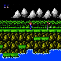 This game is made by Konami in the year 1988. In the first level you run from left to right and must shoot all that moves. There are flying extra-weapons wich you must shoot and collect. The level has three stages, from top of the hill to the water below. First this game was a coin-op, it has a 2-Player-Mode. With the stick you move, with the B-button you shoot and with A you jump. This game has six levels. In the second level you are in a tunnel and enemies comes to you which you must shoot.