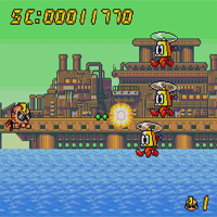 This game is made by Hudson Soft in the year 1992. This is a shootem-up-game. You control with the stick, with B you shoot normal. When you hold the button you have almost auto-fire. In the begin you can select the difficulty (3 modes). There is a continue-function. At the end of each level is an endboss. The background has parallax-scrolling.