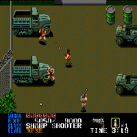 This game is made by Laser Soft in the year 1989. This is an action-game. With the stick you move, with the B-Button you shoot. The screen scrolls horizontal and vertical. This game is on CD. The intro-sequence goes over five minutes. It is similar to "Bloody wolf" but there is not so much hectic. There are some extra-weapons, one is a flame-thrower.