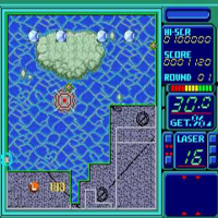 This game is made by Taito in the year 1989. This game is like the classic "Qix". You move with the stick, with B is painting. You start at the border at the screen and must fill rectangles. But there are aliens you must avoid. It is the third part of the Qix-saga. When in your rectangle is an extra you get it. There are laser, speed-ups and freezer.